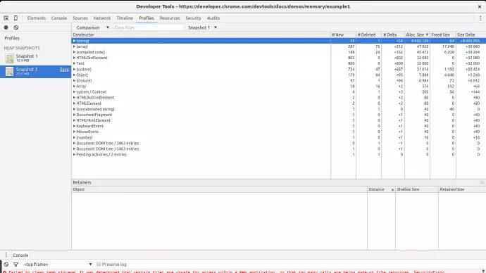 刷新页面,在页面加载结束后为堆内存捕获一个快照。我们将要使用这个快照作为我们的基准。然后再次点击按钮,等几秒,然后再拍一个快照。拍完照后,推荐的做法是在脚本中设置一个断点来停止它的运行,防止更多的内存泄露。