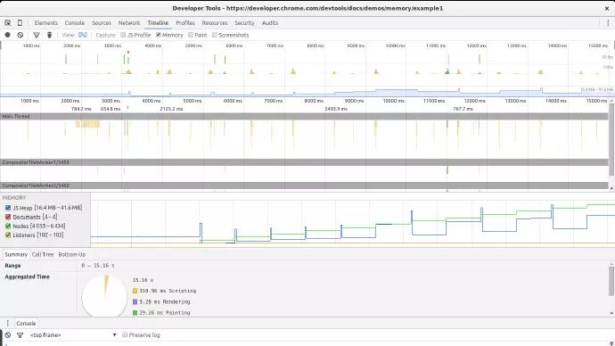 对于这个问题,timeline 视图最合适不过了。在 Chrome 中运行这个例子,打开开发者工具,定位到 timeline,选择内存并且点击记录按钮。然后去到那个页面点击按钮开始内存泄露。一段时间后停止记录,然后观察结果: