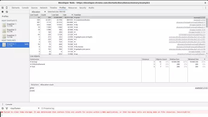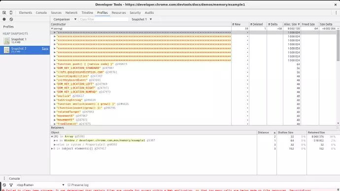 当调用 grow 的时候,它会开始创建 div 节点并且把他们追加到 DOM 上。它将会分配一个大数组并将它追加到一个全局数组中。这将会导致内存的稳定增长,使用上面提到的工具可以观察到这一点。