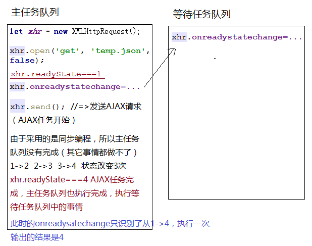 xhr.readyState===4:任务结束let xhr = new XMLHttpRequest(); xhr.open('get', 'temp.json', false); xhr.onreadystatechange = ()=> { console.log(xhr.readyState); }; xhr.send();//=>只输出一次结果是4